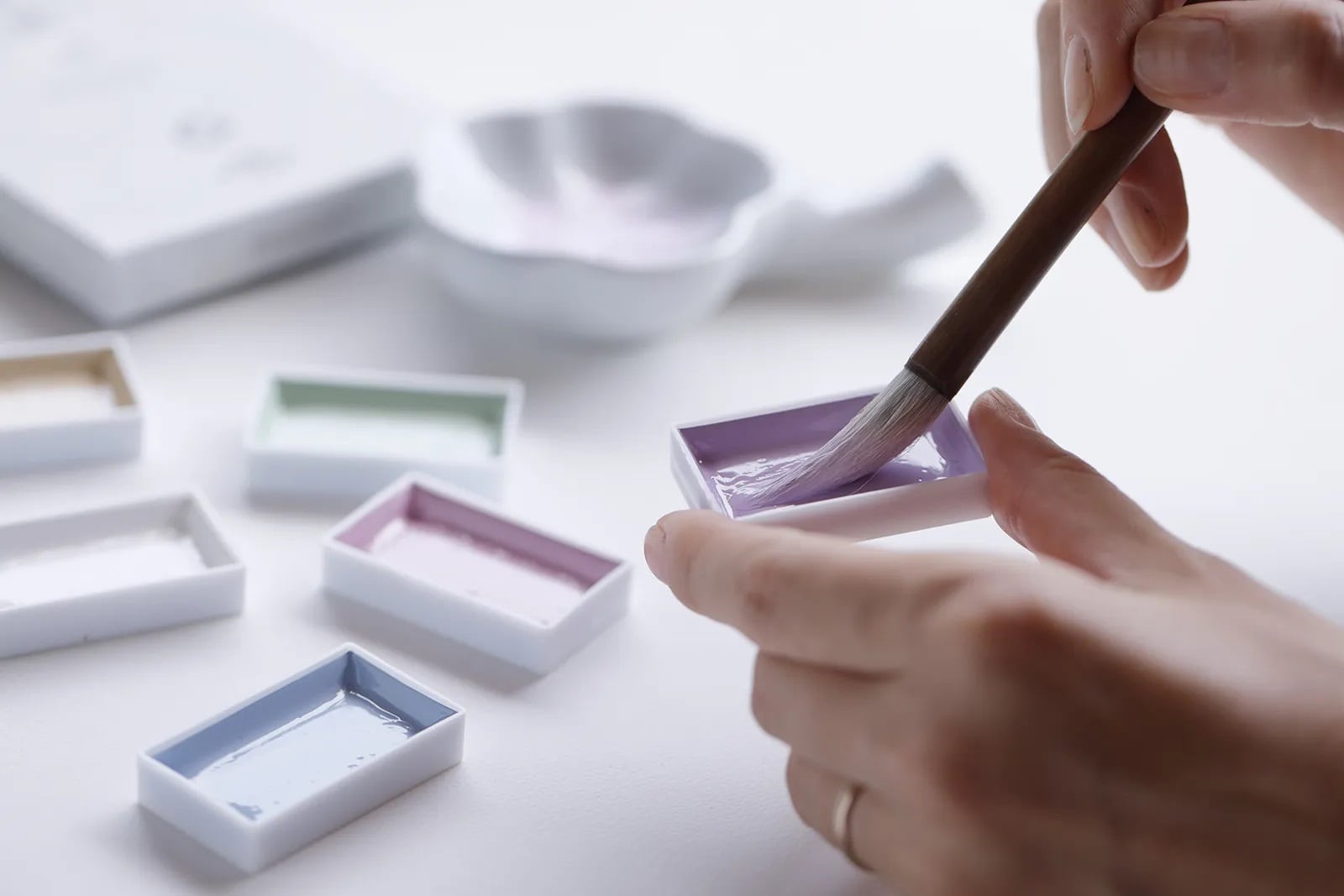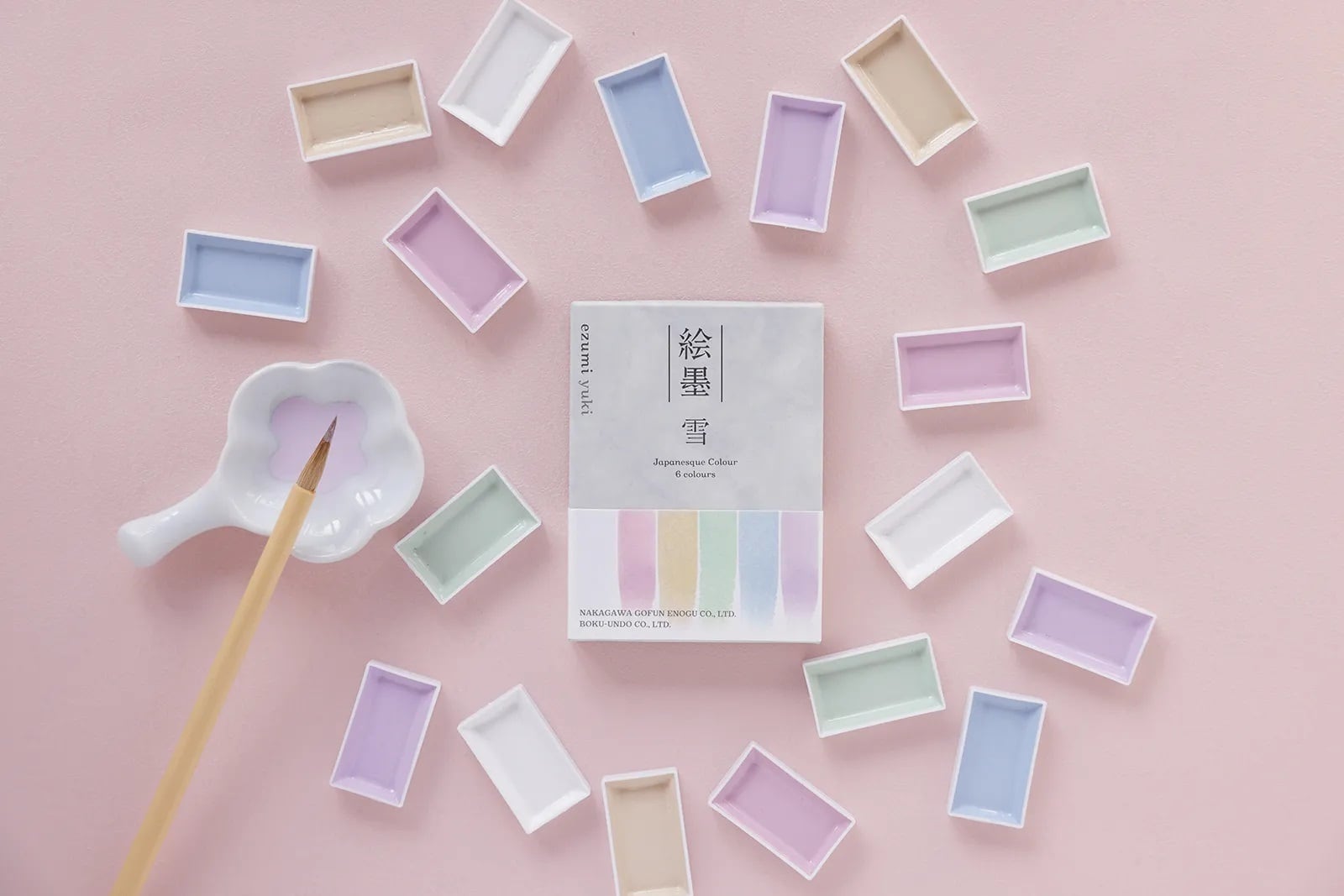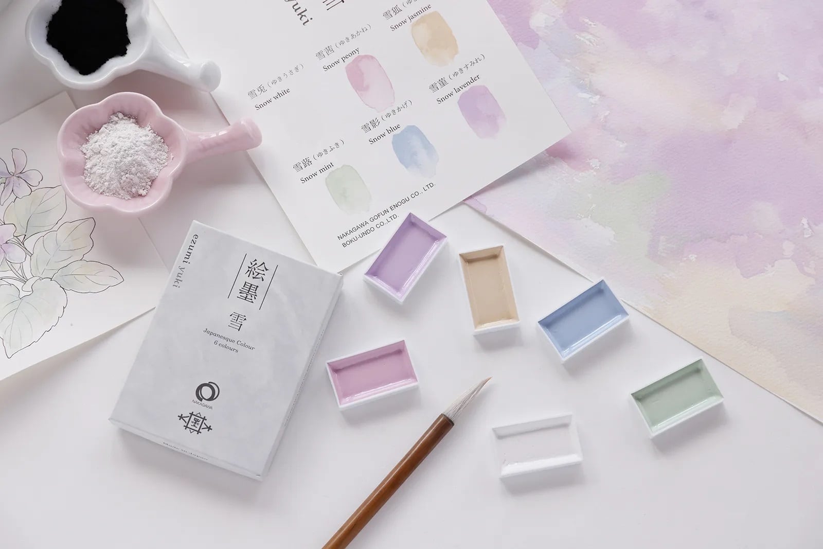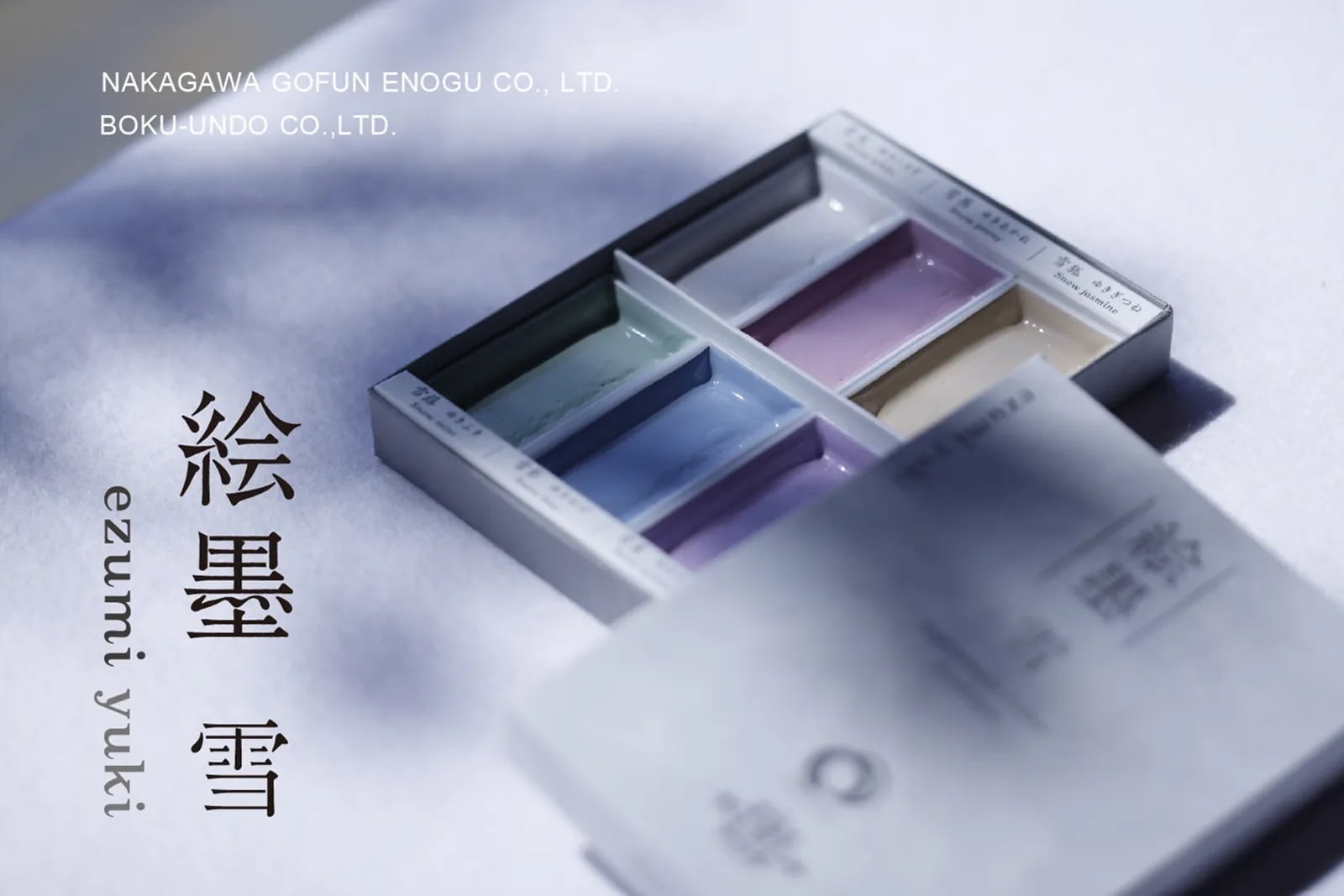 「絵墨 雪」は胡粉や岩絵具を製造するナカガワ胡粉絵具株式会社と、墨を製造する株式会社墨運堂の共同企画商品です。白を極める企業と黒を極める企業の異色のコラボレーションにより商品化が実現しました。長きに亘り培われた互いの技術と経験をかけ合わせることで「絵墨シリーズ」を新たな境地へと導きます。
