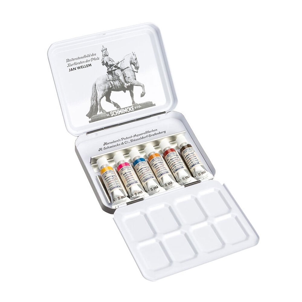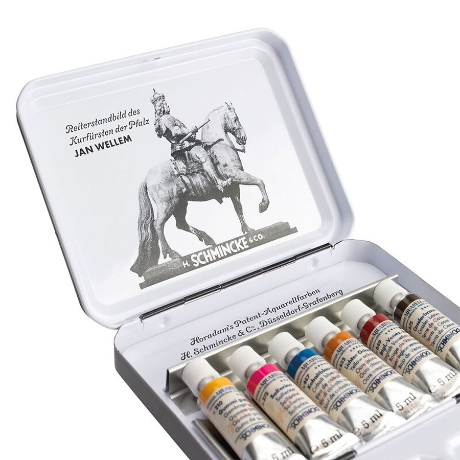 ヤン・ヴェレンは、プファルツ選帝侯ヨハン・ヴィルヘルム2 世(1658‒1716)のことで、シュミンケ社の本拠地でもあるデュッセルドルフを文化の中心地へと発展させた人物です。壮麗な宮廷、芸術と文化の庇護、そして民衆的な人柄で知られ、そのことから「ヤン・ヴェレン」という愛称で親しまれていました。この芸術を愛した選帝侯こそが、1930年代のホラダム透明水彩絵具トラベルケースの着想源であったと考えられています。このセットをオリジナルに基づいて復刻し、特別なプリントを施したコレクターズアイテムとして蘇らせました。