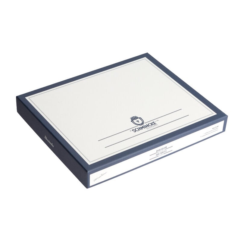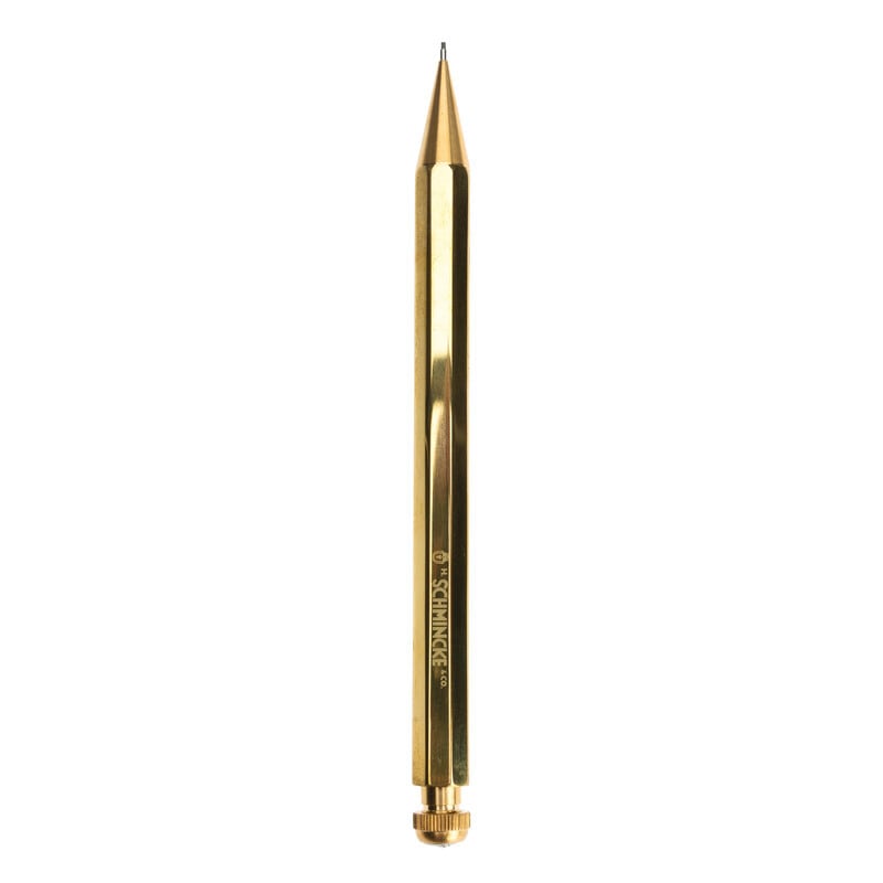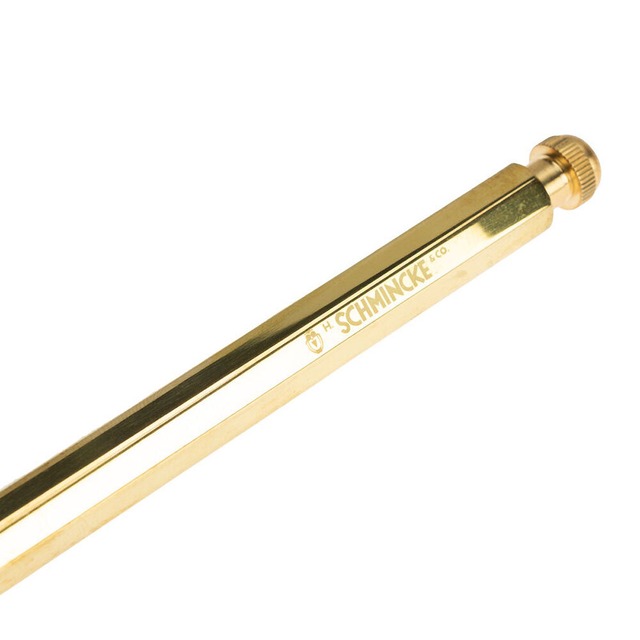 シュミンケの刻印が施されたゴールドカラーの Kaweco( カヴェコ)真鍮製シャープペンシル(芯径 0.9mm)を同梱しています。高級仕様の木製の箱に収められ、ヴィンテージ調の紙製ボックスで提供されます。