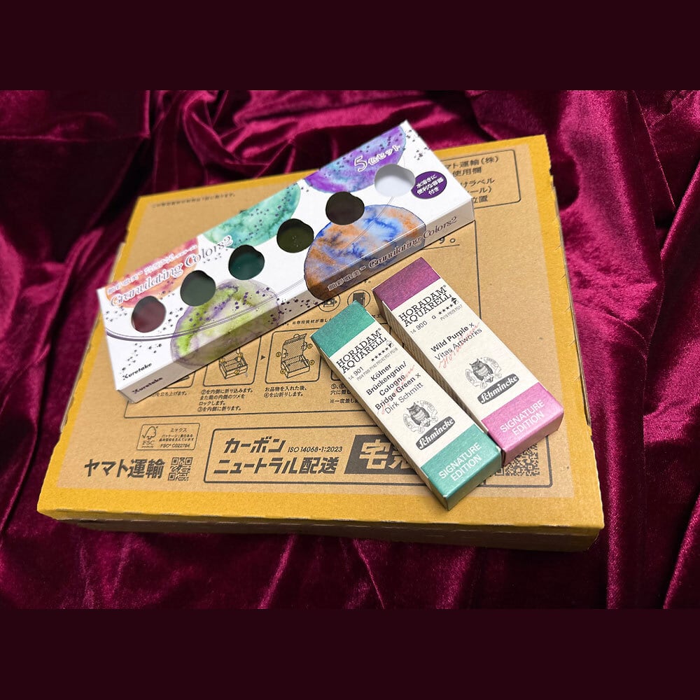 作品制作に使う画材をランダムに入れて確定商品とランダム商品合わせて、販売価格16,000円~20,000円分(当たり枠)を宅急便コンパクトに詰めてお送りいたします。