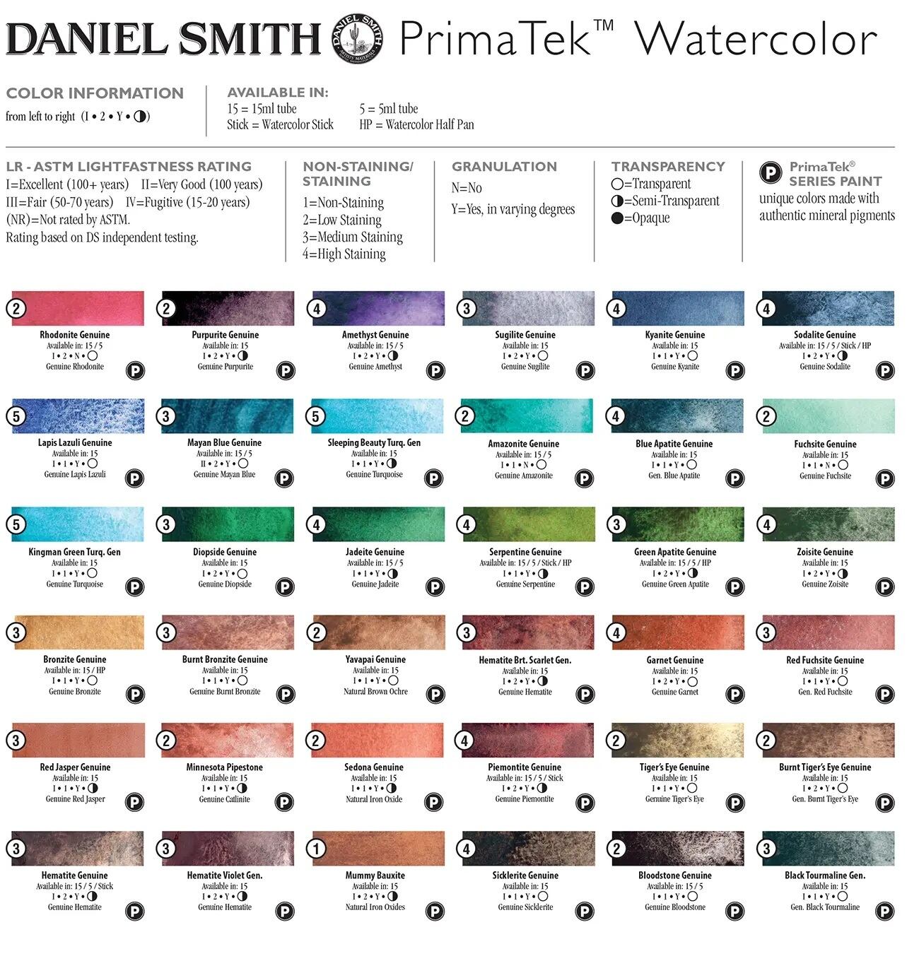 鉱物、半貴石から造られたプリマテック。ダニエルスミスには鉱物の原石を探す鉱物学者が折り、それを顔料にして分散させて絵の具にしています。プリマテックは素晴らしいグラニュレーション(粒状化)を表現し、動きや深みを与えます。