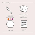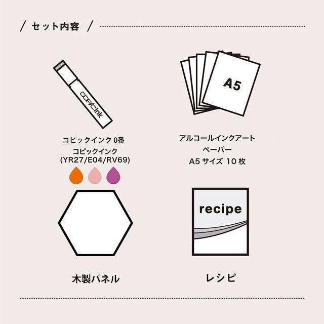 「アルコールインクアート」に必要な道具が揃った限定セットです。バリエーションは違う色組で3種類、作り方や作例が載ったレシピブックが入っているので初めての方にも気軽にお楽しみいただけます。